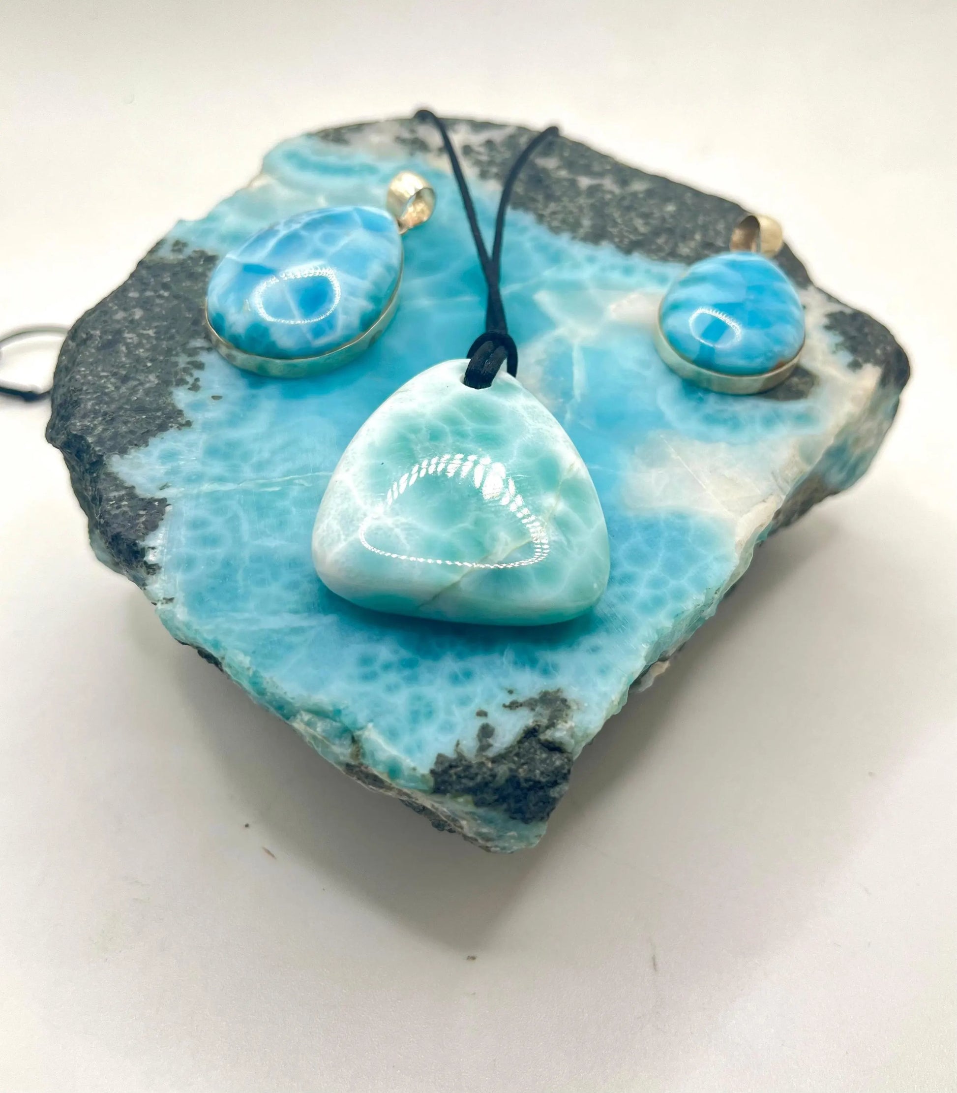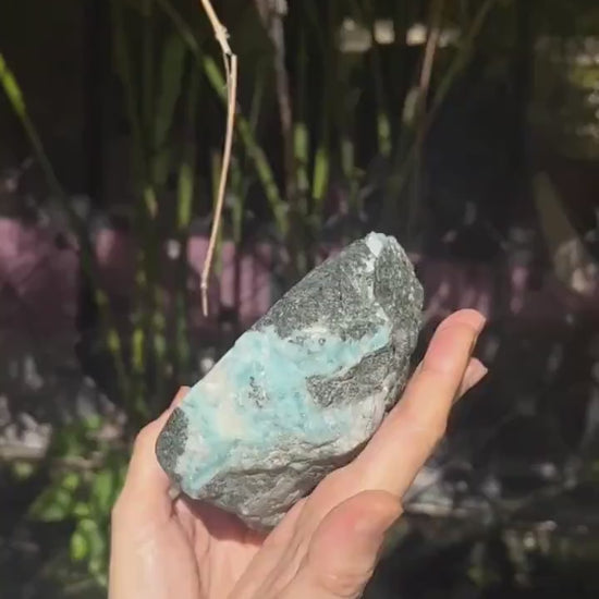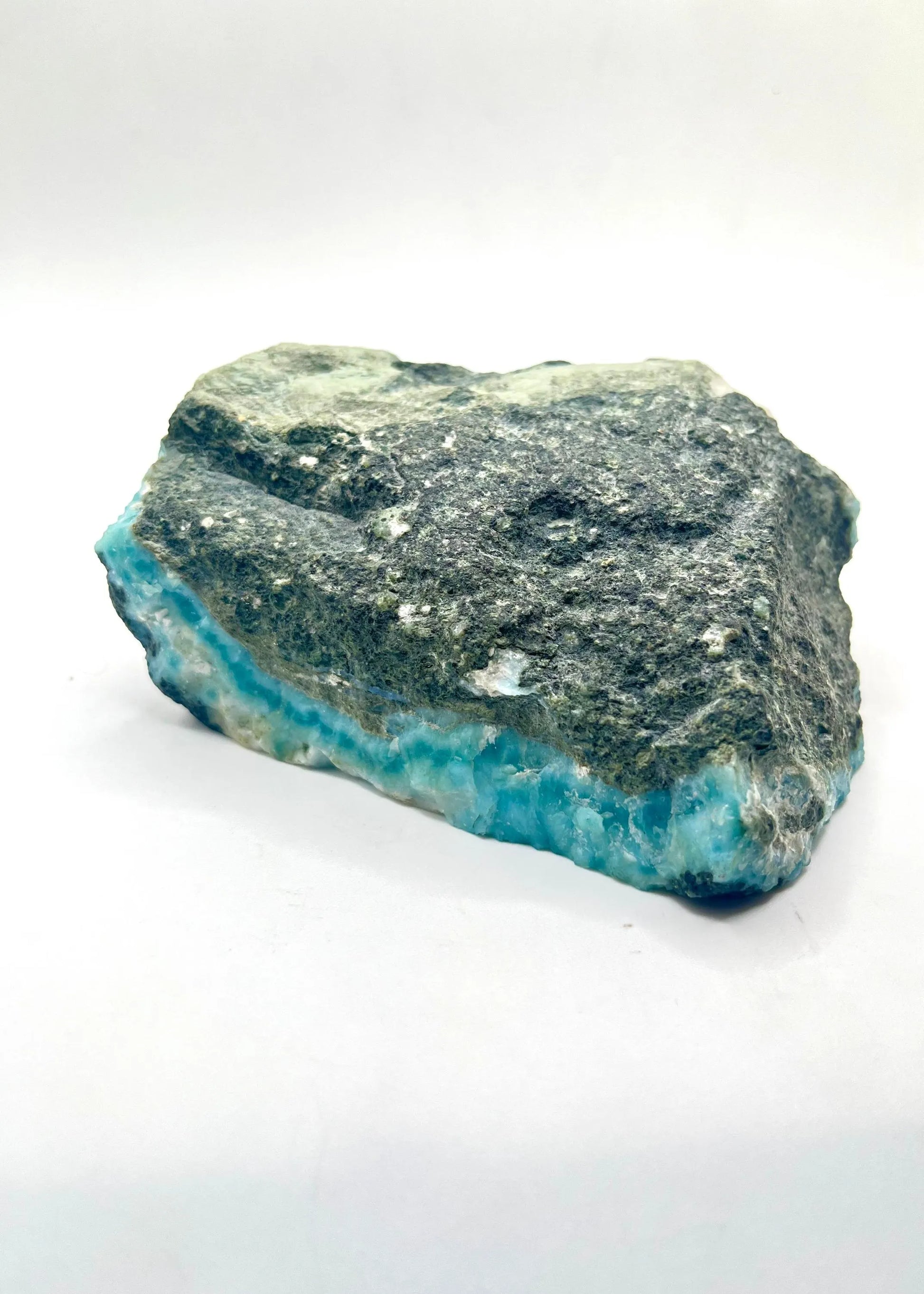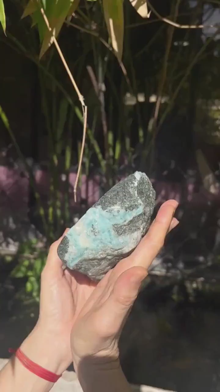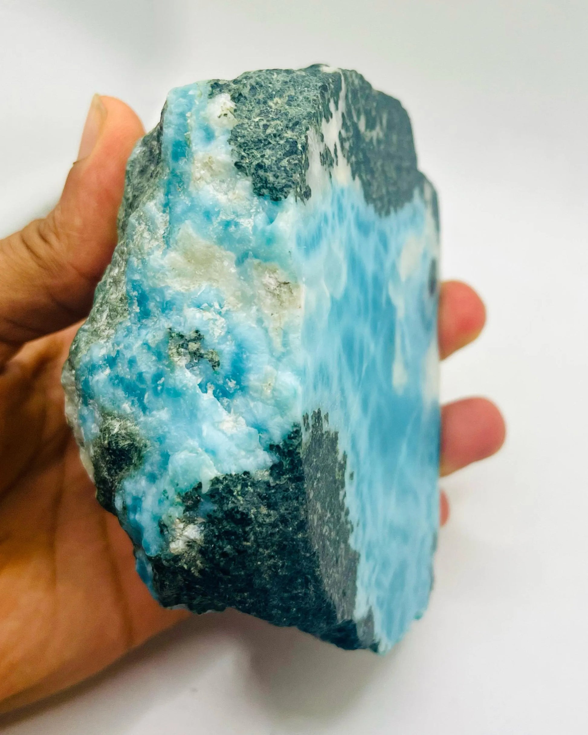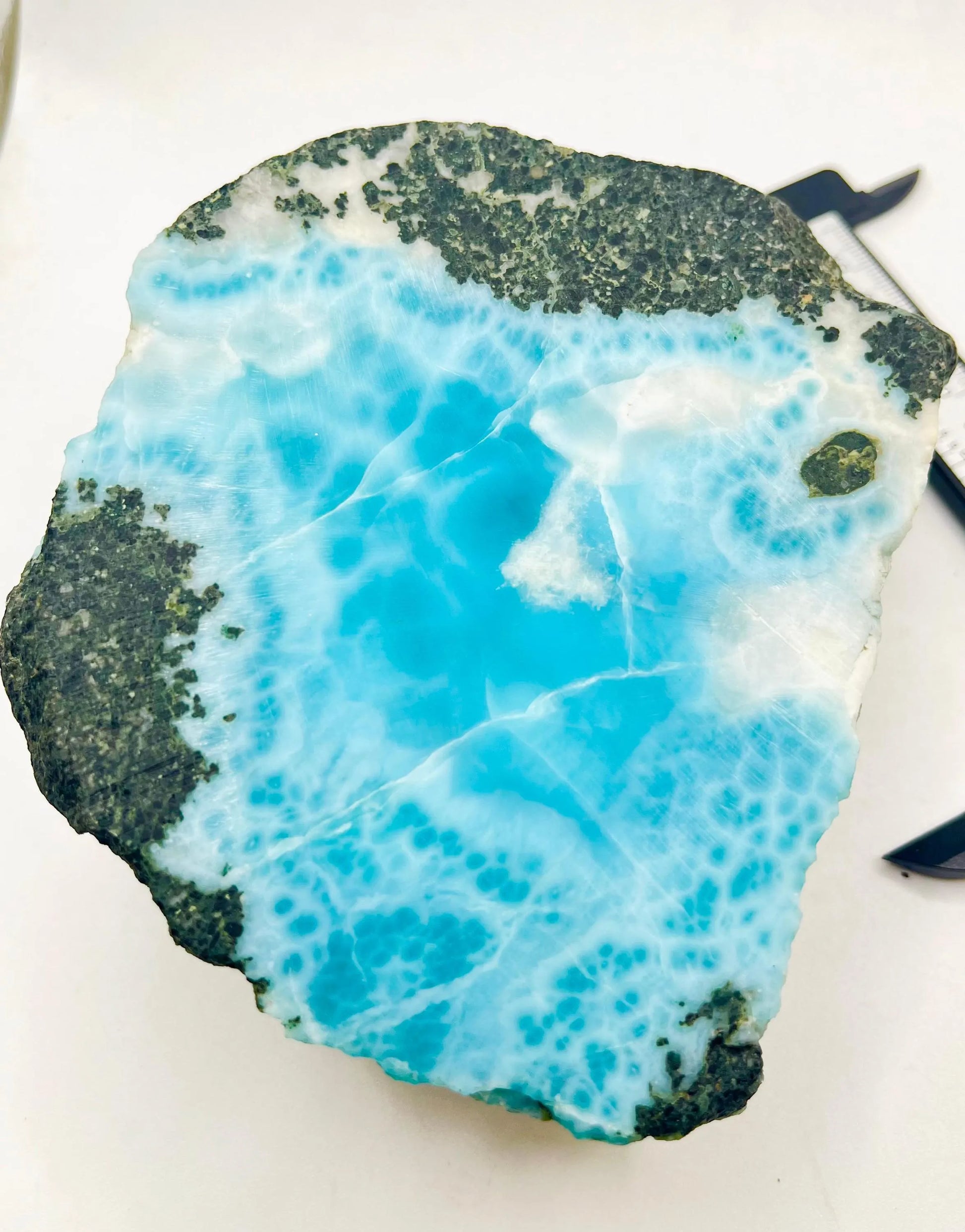 Esta impresionante losa de larimar es una pieza excepcional, semipulida, de larimar azul natural, extraída directamente de las minas de Barahona, República Dominicana, el único lugar del mundo donde se encuentra esta gema. Sus fascinantes patrones que evocan el océano y sus relajantes tonalidades caribeñas la convierten en una auténtica joya de coleccionista y una pieza versátil para la creación de joyas, el alambrismo o para exhibir en tu colección de cristales.