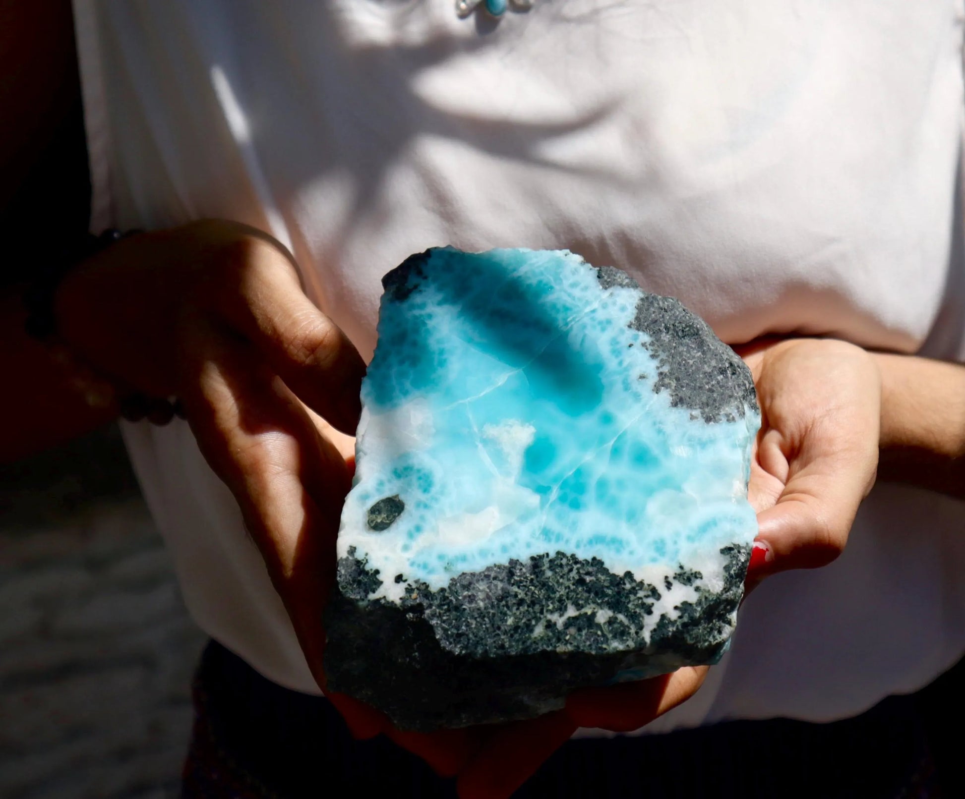 Recibirás esta misma losa de Larimar, que llegará en un embalaje seguro, acompañada de una tarjeta informativa que explica la historia y el significado del Larimar.
