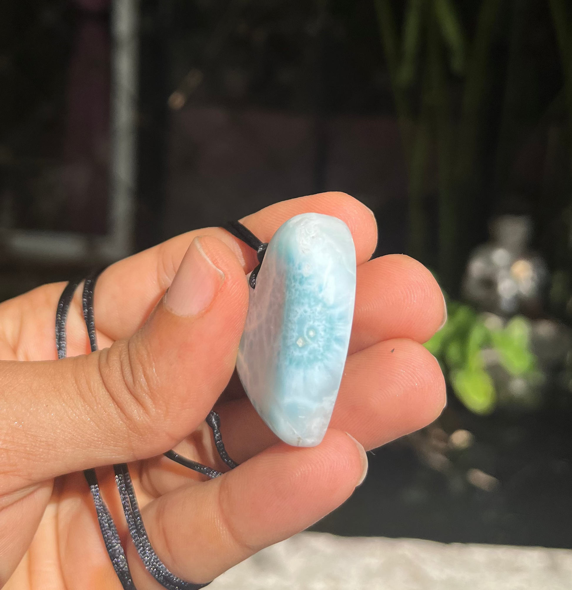 This Amazing Larimar Heart Necklace, a one-of-a-kind creation handcrafted in the Dominican Republic — the only place on Earth where Larimar is found. This rare gemstone, with its mesmerizing waves of turquoise and sky blue, embodies the peaceful rhythm of the sea and the energy of pure tranquility.