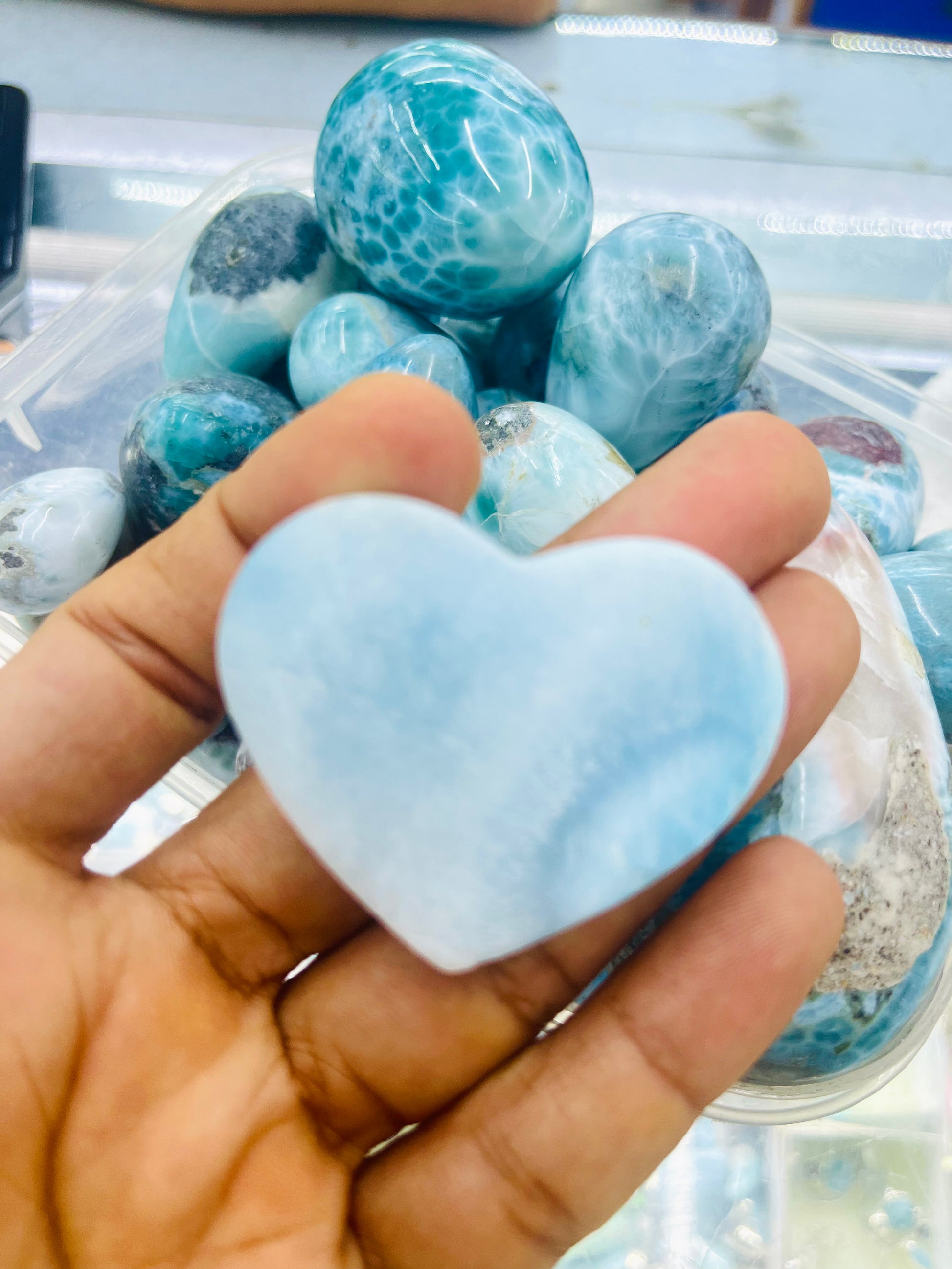 Each heart showcases Larimar’s signature oceanic patterns — swirls of sky blue, white, and turquoise that resemble the calm waves of the Caribbean Sea. Smooth to the touch and filled with natural beauty, this gemstone makes a stunning centerpiece for jewelry, energy work, or personal collection.