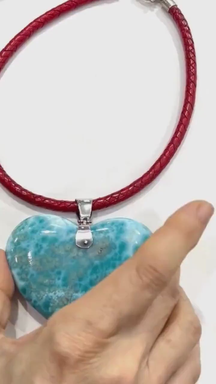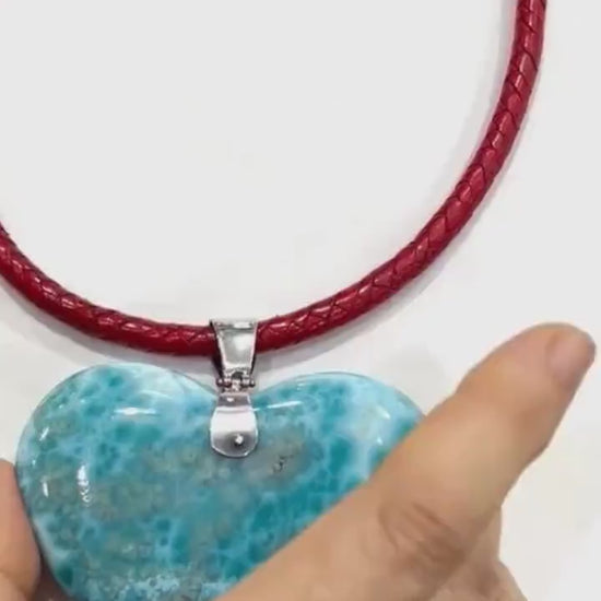 Larimar Heart XL Necklace made with 925 Sterling Silver & Red Leather